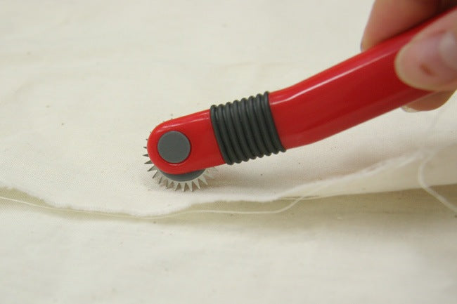 型紙にそって歯車をころがしながら前に押してしるし(穴)をあけます。