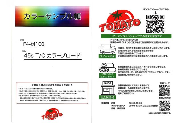 ![【サンプル帳】45s T/Cカラーブロード[F4-t4100smp]](http://www.nippori-tomato-onlineshop.com/cdn/shop/files/F4-t4100smp_3_ea1f2e33-f0b9-41d8-bb47-6112dc32d83b.jpg?v=1722408483&width=1445)