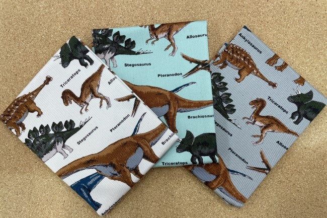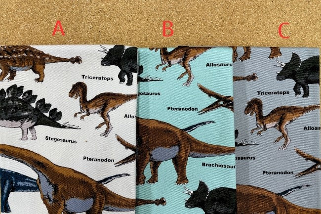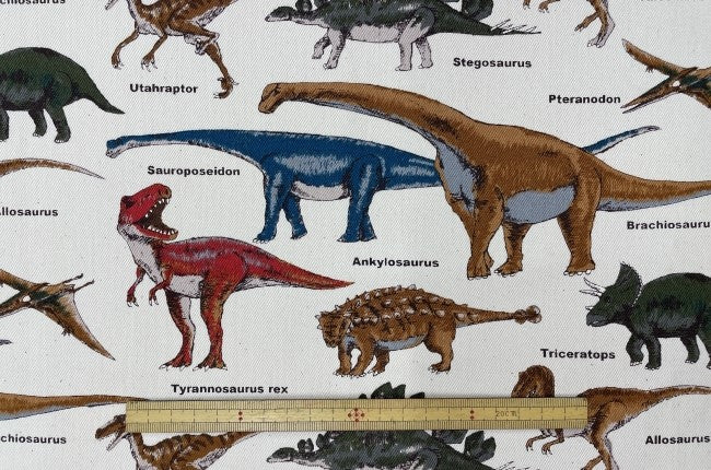 トリケラトプス、プテラノドンなどがリアルに描かれた図鑑風の恐竜柄生地です。