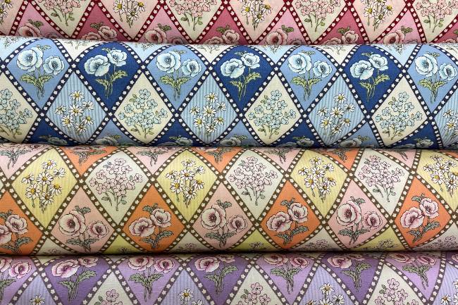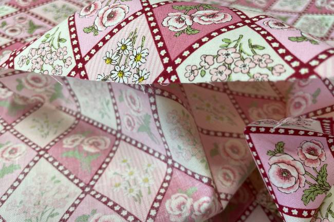 レトロさを感じる雰囲気のひし形格子花柄のブロード生地です。