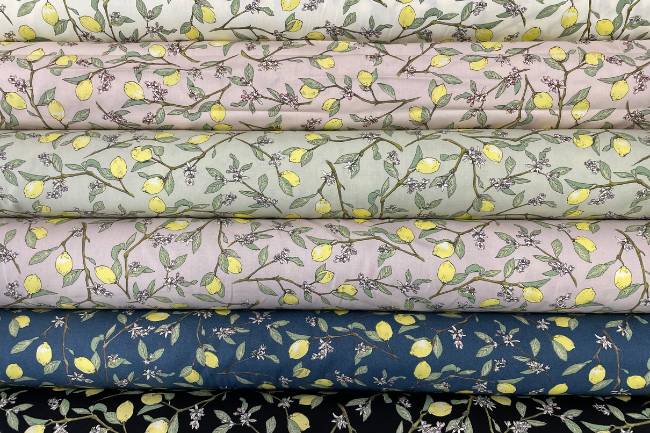 ちょっと大人な雰囲気の可憐な枝付きレモン柄のブロード生地です。