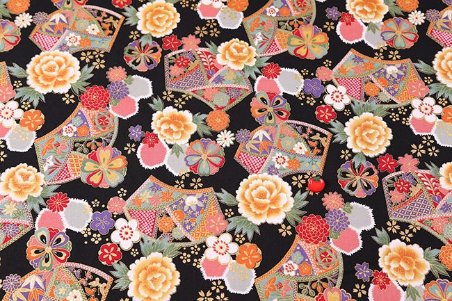 柄合わせの扇に吉祥花を散し、金彩と絞りの風囲気が柄に奥行きを出しています。