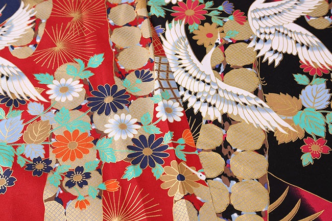 金の水玉の雲取りの中に 縁起の良い赤富士に鶴が舞います。