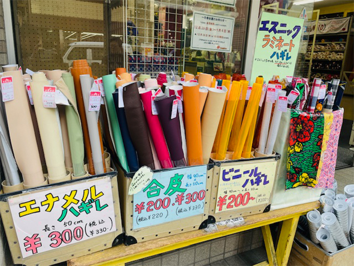 お店の外にはハギレコーナーがございます合皮やビニールなど種類も多数あり!