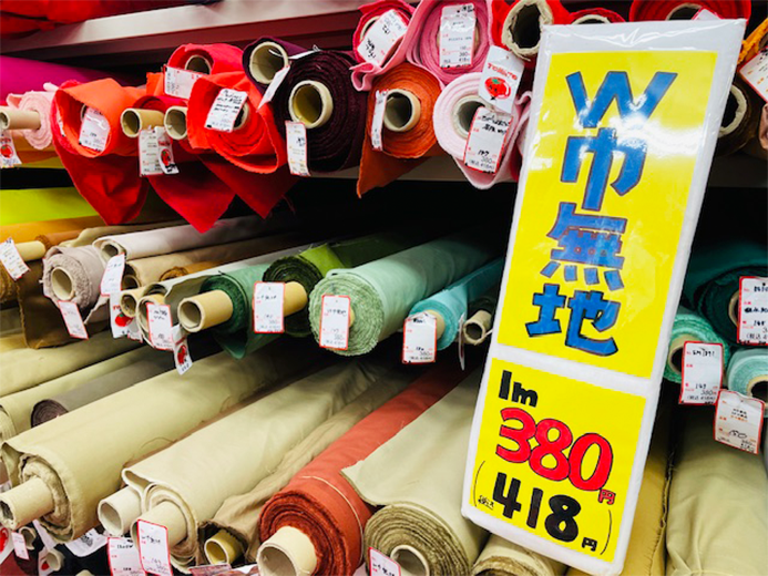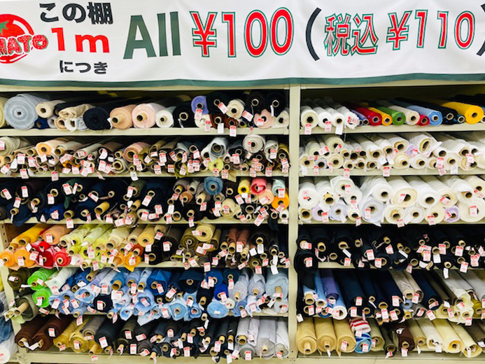 トマト名物100円コーナー!無地や柄物など多数の生地を取り揃えております毎日1000m以上補充しており、連日にぎわっています!